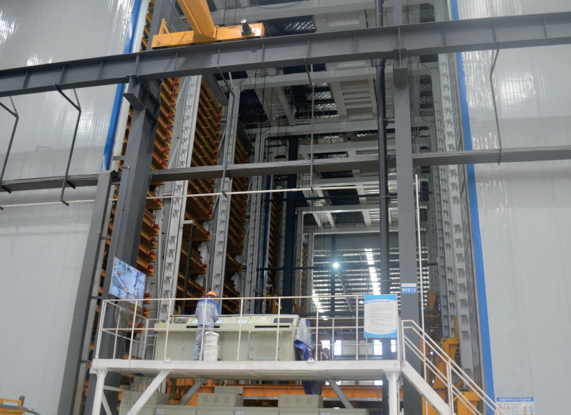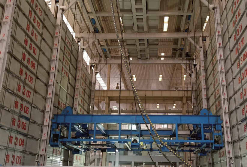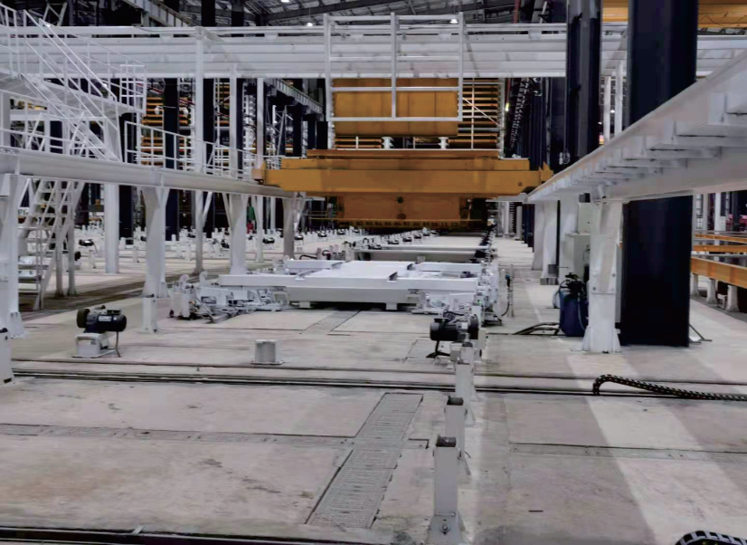 码垛机的工作效率是决定预制构件生产节拍的重要节点,本项目采用电梯式码垛机三列可同时工作,效率是传统码垛机的三倍,工作节拍可达到5分钟以内。同时将养护窑设计为 30 层,180个有效养护仓位,窑内温度温度独立控制,自动调节,提高产能的同时也增强了构件养护效果。
